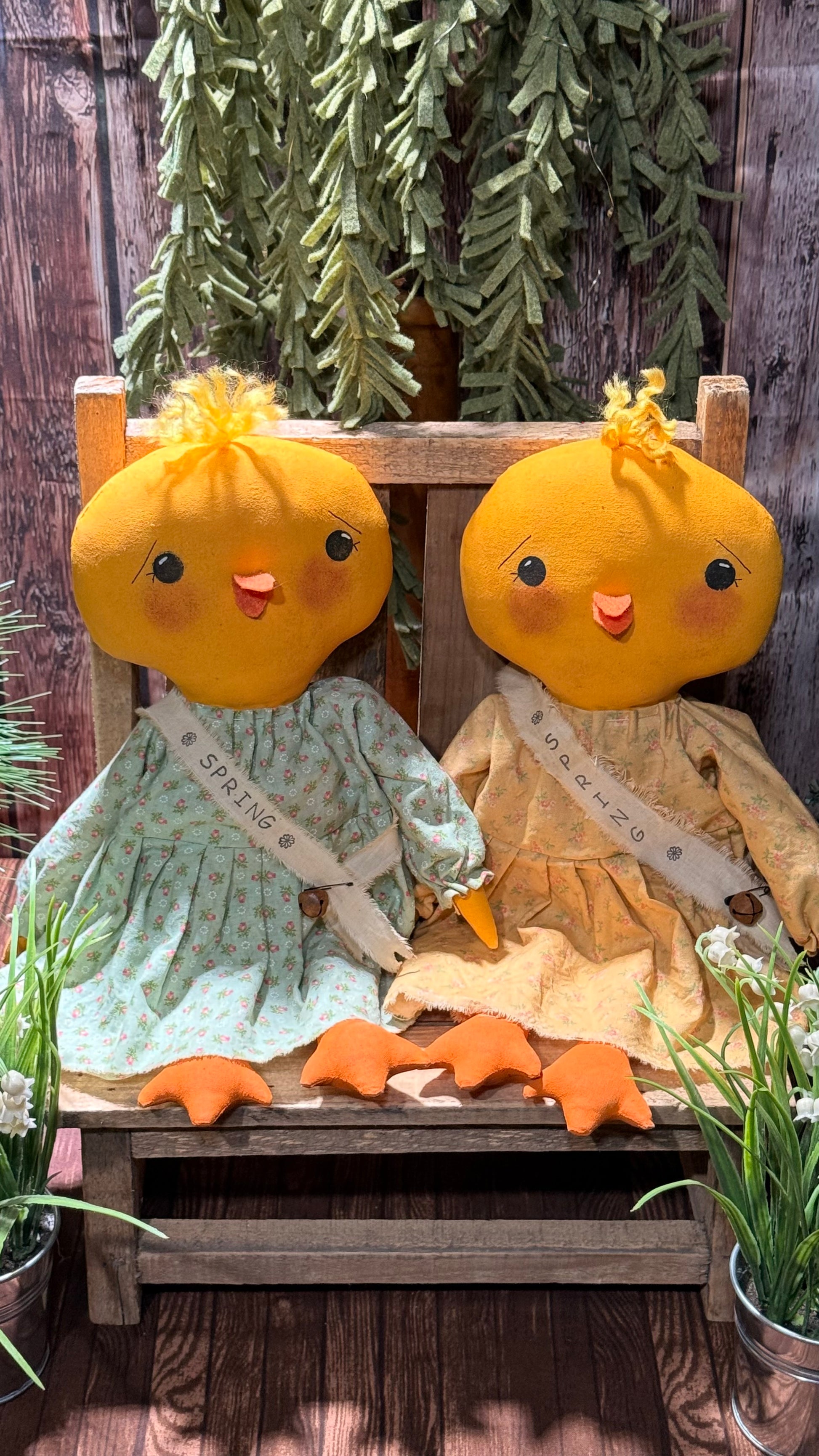 These two little chicks are waiting patiently for spring to get here. Adorned in their little grunged dresses and spring sash. How cute are their little tufts of hair at the top of their heads?? These chicks are adorable!